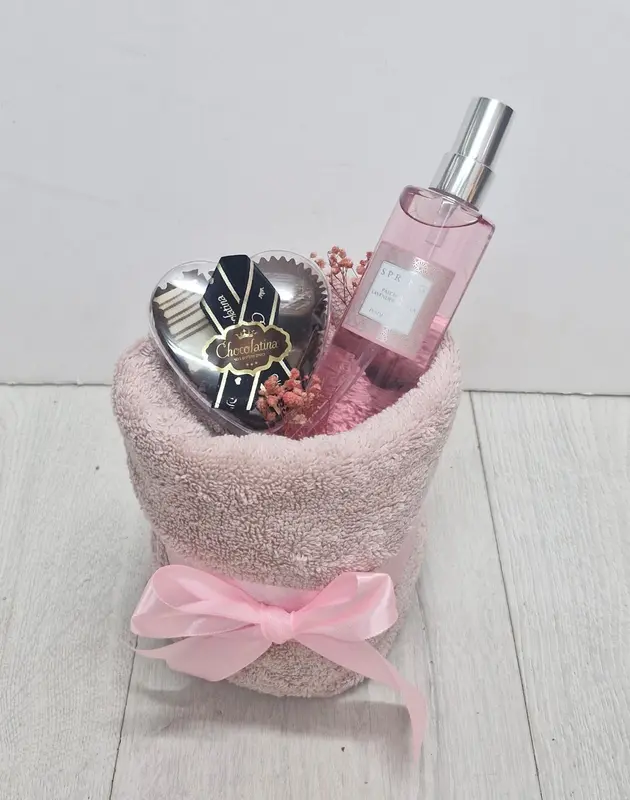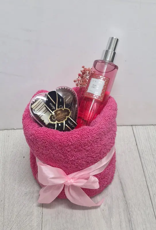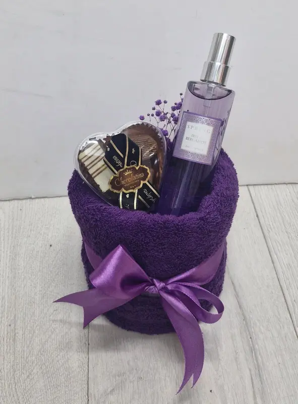 מגבת ידיים, מי גוף ומארז 3 פרלינים לב.
