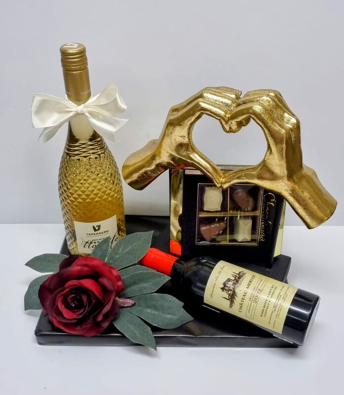 המארז מכיל:ידי הלב מעוצבות לנוי, יין מוסקטו, בקבוק ערכת פותחנים, מארז רביעיית פרלינים מעוצב יחד.